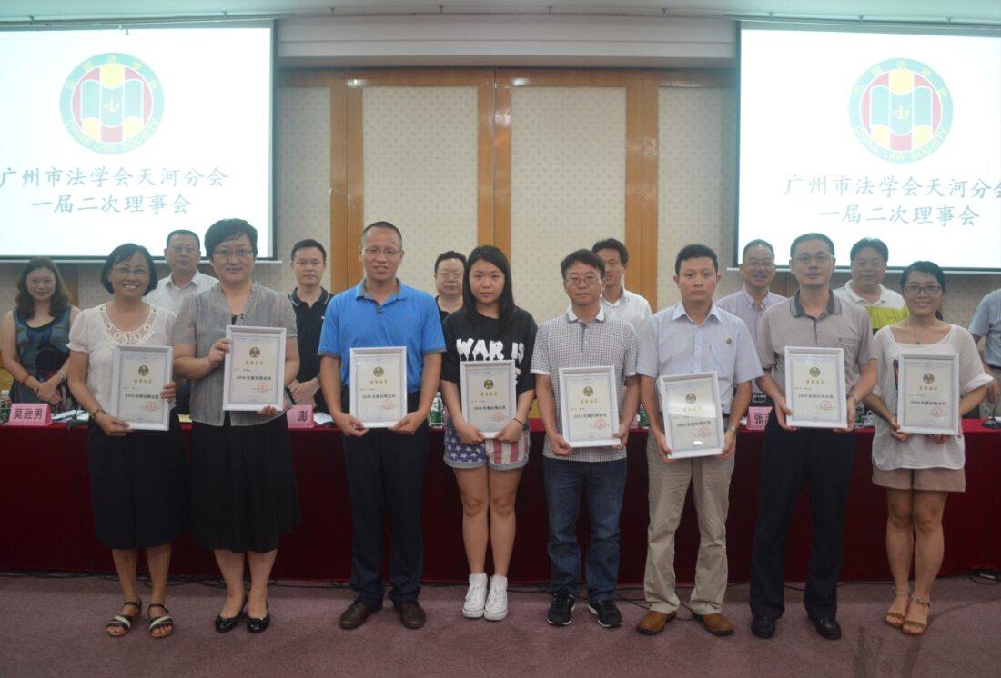 广州市法学会天河分会昨天召开了广州市天河区法学会一届二次理事会,会议传达了省法学会八届二次理事会暨广州市区级法学会建设现场会的简要精神,审议通过了《广州市天河区法学会工作细则(修订稿)》、《广州市法学会天河分会促进法学研究和奖励优秀法学人才暂行办法》。同时,为鼓励先进,树立榜样,进一步推动广州市法学会天河分会各项工作的开展,经理事会决定表彰了2014年度优秀会员。我系副主任李岚教授在过去一年中,积极参与法学会组织的各项活动及学术研讨会等,并曾多次组织系内教师活动、组织学生进行法治宣传活动以及与实务部门进行联动性法学教育改革模式试验,荣幸地被评为2014年度优秀会员。