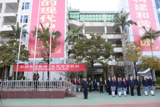 暖阳照映在学生们朝气蓬勃的脸庞上,微风吹动国旗,简庭长在国旗下进行庄重的发言。全校2000余名师生专注聆听这场宪法知识演讲,通过简庭长充满激情的话语和四个真实鲜活的案例分析,学生们渐渐增进了对宪法的认识,对依法维权重要性的理解。此次演讲,推动学生坚定宪法自信、增强宪法自觉、弘扬宪法精神、维护宪法法律权威。增强学生们自我保护、应急处理的意识,让师生们进一步了解宪法、校园欺凌等相关法律知识。