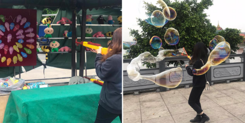 (女教职工们玩小游戏:打气球、吹泡泡)