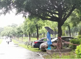 (辅导员老师指引同学们做核酸检测) (辅导员彭老师在雨中守候核酸检测的学生们)