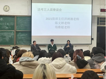 2021级班主任洪树湘,专任教师陈文婷、郑维聪三位老师以“法考”为主题为同学们举办了“法考三人谈”座谈会。会上,三位老师先后发言,交流讨论法考和考研的经验。洪树湘老师认为,法考备考时应针对个人情况了解院校概况等信息,坚定意志,保持专注、自律并做好备考计划,多前往自习室学习。陈文婷老师认为,备考可视作项目管理,分为启动、计划、实施、监控与管理和收尾五个环节。通过分解计划,设定目标,及时调整心态,提高有效学习时间,才能长久进步。郑维聪老师认为,同学们需明晰法考和考研的目的,学会接受失败,才能越挫越勇。法考虽难,但不需妖魔化,需要讲究技巧。客观题避免投机取巧,用主观题的方法去做,学会放弃实在学不会的知识点。最后,老师对同学们在提问环节为学生们进行了解答,现场气氛活跃。