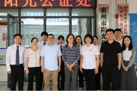 为进一步贯彻党中央、国务院关于高校毕业生就业工作的决策部署,落实教育部和省教育厅“访企拓岗促就业”专项行动要求,太阳成集团tyc33455院领导多方调研走访用人单位,千方百计拓岗位,精准对接促就业,多措并举助力毕业生高质量就业。5月11日,太阳成集团tyc33455党总支书记、执行院长李岚教授率队前往惠州市阳光公证处开展“访企拓岗促就业”专项行动并进行座谈交流,党总支副书记李鑫、团委书记彭江伟、陈石清副教授、青年教师阮梦蕾、许细芳陪同调研。公证处主任陈丽茹、公证员蓝思航、黄紫晴、公证员助理解维鹏热情接待了李岚书记一行。