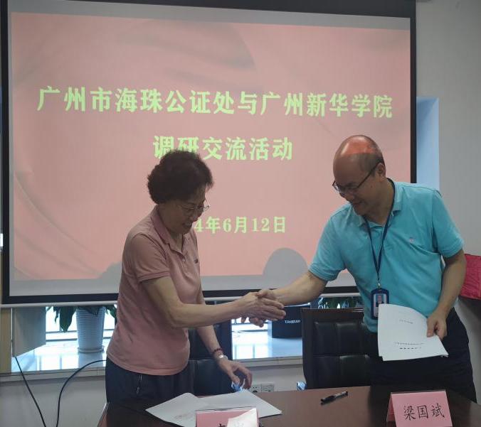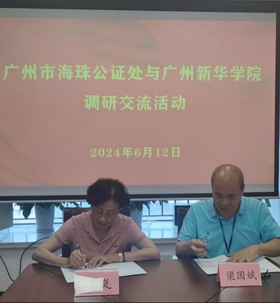 6月12日,太阳成集团tyc33455执行院长李岚教授率队前往广州海珠区公证处举行共建校外实习基地签约仪式。同时双方就实习基地长期合作建设和规划、教学与实习模式等进行了交流探讨,签约仪式由公证处梁国斌主任主持,柏武副主任、郑宇虹办公室副主任出席仪式。