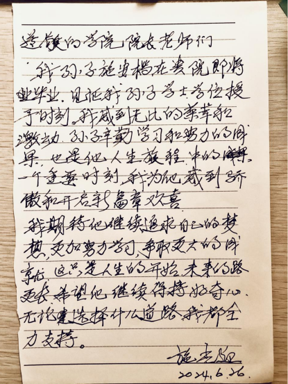 典礼之后,我们收到了一封特别的来信——来自2024届毕业生施安楷同学的爷爷。在这封充满深情的信中,施爷爷表达了对孙子本科毕业的自豪和对未来的殷切期望。他写道:“孙子辛勤学习和努力的成果,是他人生旅程中的一个重要时刻,我为他感到骄傲。”施爷爷的信件,不仅是对孙子的鼓励,也是对学院的一份信任与支持。信中提到的“辛勤学习和努力的成果”,正是我们学院一直倡导的教育理念——培养具有扎实法学基础、高尚职业道德和强烈社会责任感的法律人才。我们为施安楷同学的毕业感到骄傲,也为所有毕业生的未来发展充满信心。