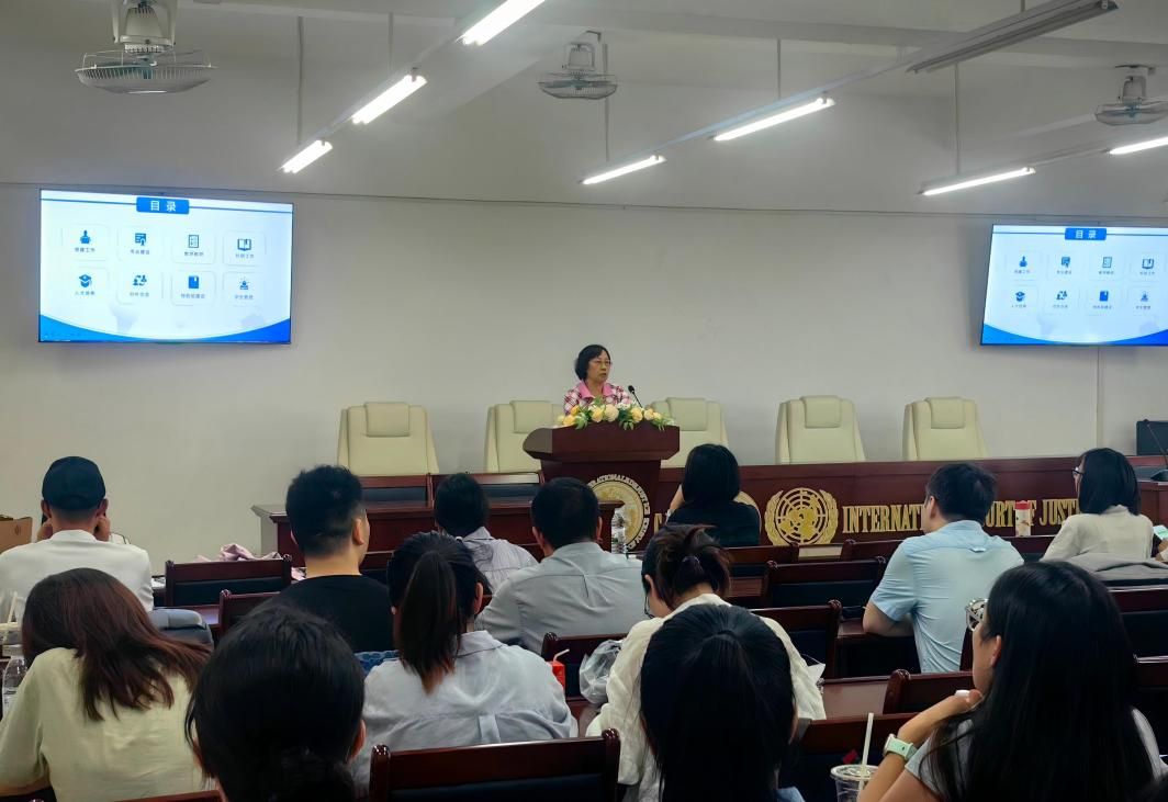 接着,李岚院长进行新学期工作部署。要求做好开学教学检查、二十周年校庆筹备等工作,强化党总支的政治引领作用,持续优化学风校风,强调就业是专业评估、学科建设与招生的重要依据,教师应在教学中增强学生的就业意识,注重法考与考研辅导。希望全体教职工恪尽职守、积极响应、协同合作,共同为学院发展贡献力量。
