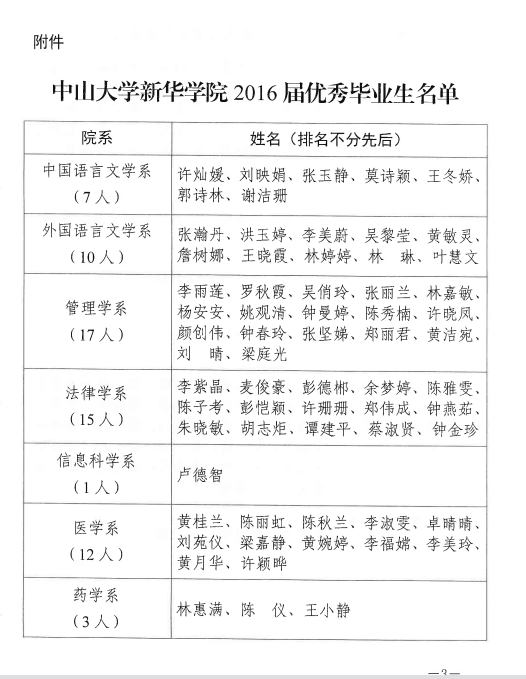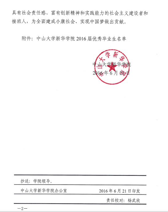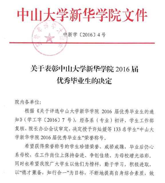 关于表彰中山大学新华学院2016届优秀毕业生的决定