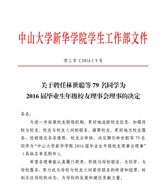 关于聘任林世聪等79名同学为2016届年级校友理事的决定