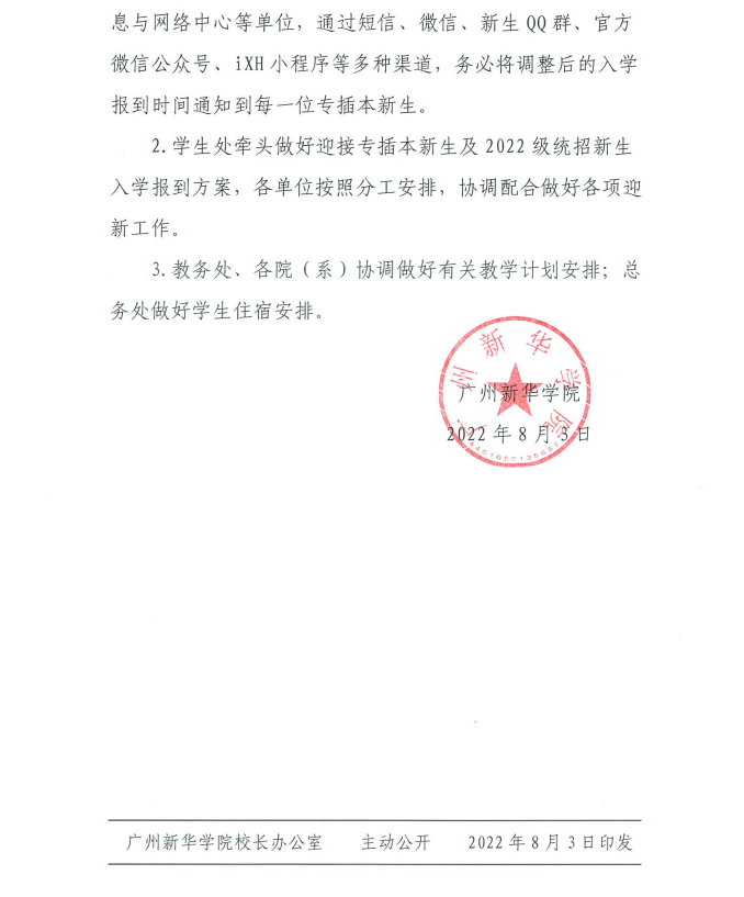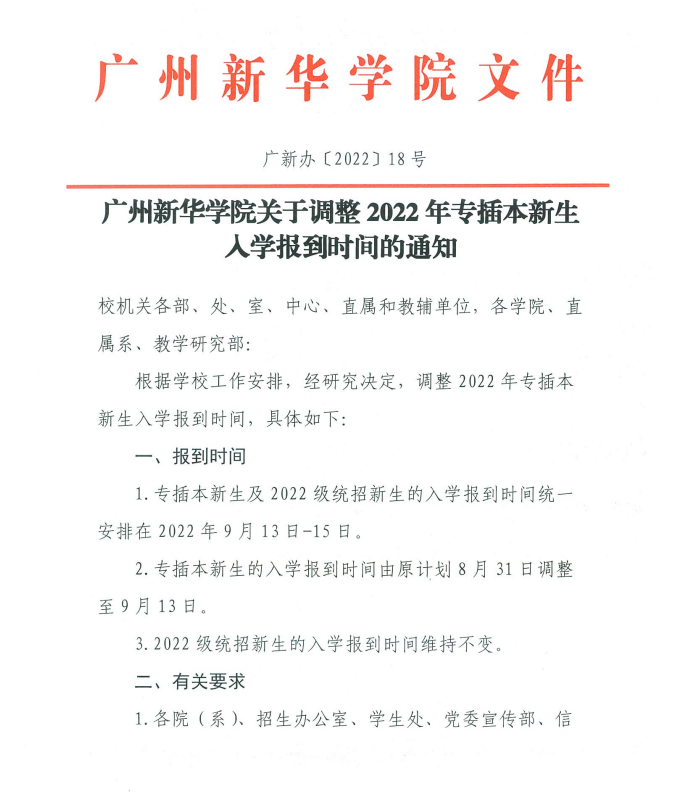 广州新华学院关于调整2022年专插本新生入学报到时间的通知