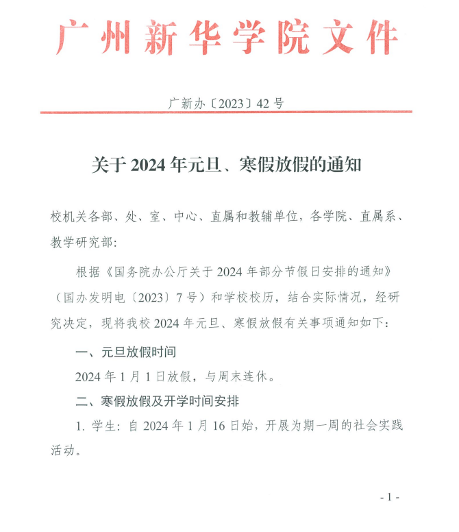 关于2024年元旦、寒假放假的通知