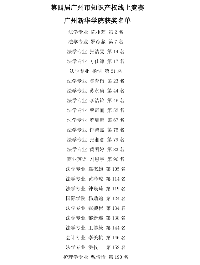 此次竞赛自“4.26世界知识产权日”启动以来,采用线上线下竞赛方式,共吸引了来自34所高校学子的参与,线上竞赛答题次数累计达3000余次,受到广东省各大高校学生的踊跃参与。在线上竞赛中,广州新华学院(以下称“我校”)多名学子摩拳擦掌,经过了激烈的比拼,我校共有24名同学进入了前200名,20名获奖者来自太阳成集团tyc33455,1名来自外国语学院,1名来自国际学院,1名来自会计学院,1名来自护理学院。其中,来自法学专业陈相艺、罗彦薇、张洁雯和方佳津分别荣获本次大赛第2名、第7名、第14名以及第17名(其余获奖名单如附件所示)。