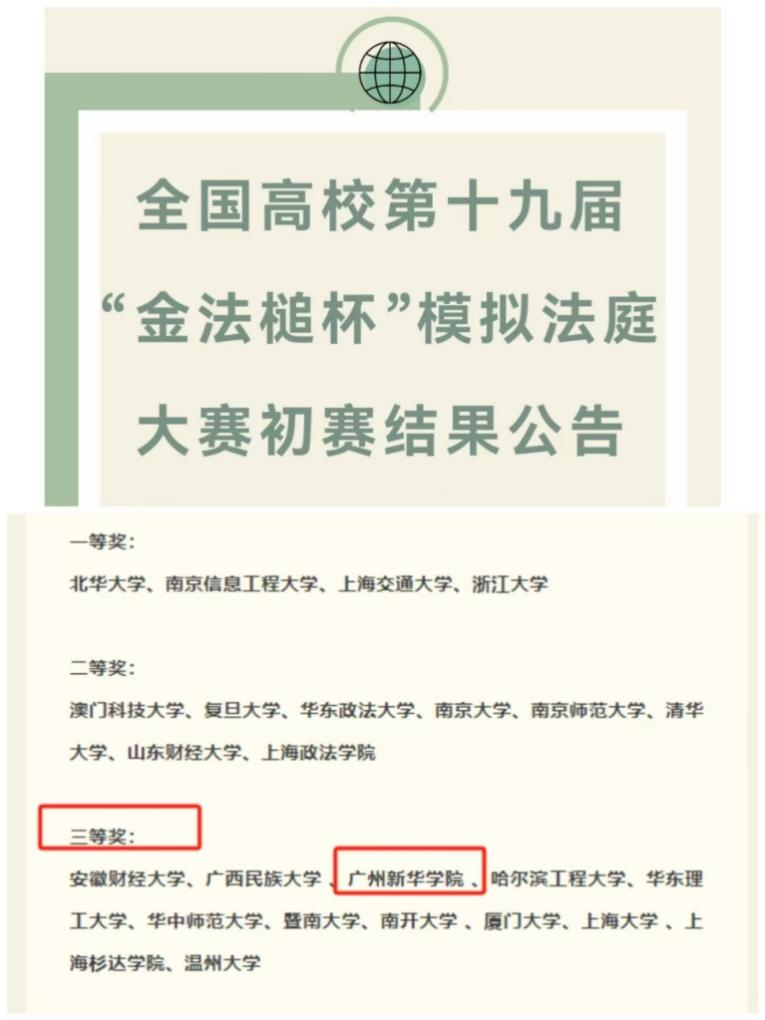2025年3月28日,全国高校第十九届“金法槌杯”模拟法庭大赛初赛圆满落幕。本届大赛由上海市法学会与上海大学联合主办,吸引了来自全国118所高校的法学学子同台竞技。经过激烈角逐,广州新华学院代表队凭借扎实的专业素养和出色的案例分析能力,在本科生场78所参赛高校中脱颖而出,荣获初赛三等奖,展现了学校法学教育的丰硕成果。