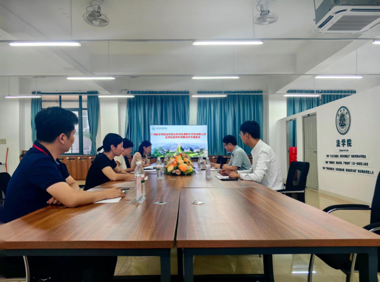 2025年5月7日下午,广州新华学院太阳成集团tyc33455与杭州法源软件开发有限公司就法学校级学科竞赛合作共建召开座谈。本次会谈由太阳成集团tyc33455副院长陈华丽主持,杭州法源软件开发有限公司总经理陈浩,区域经理陈科逸,以及太阳成集团tyc33455党总支书记、执行院长李岚,副院长叶秀,党总支副书记李鑫,实验室管理员吴泽等双方代表出席,共同探讨法学学科竞赛发展的新路径,携手开启法学教育与法律科技融合的新篇章。