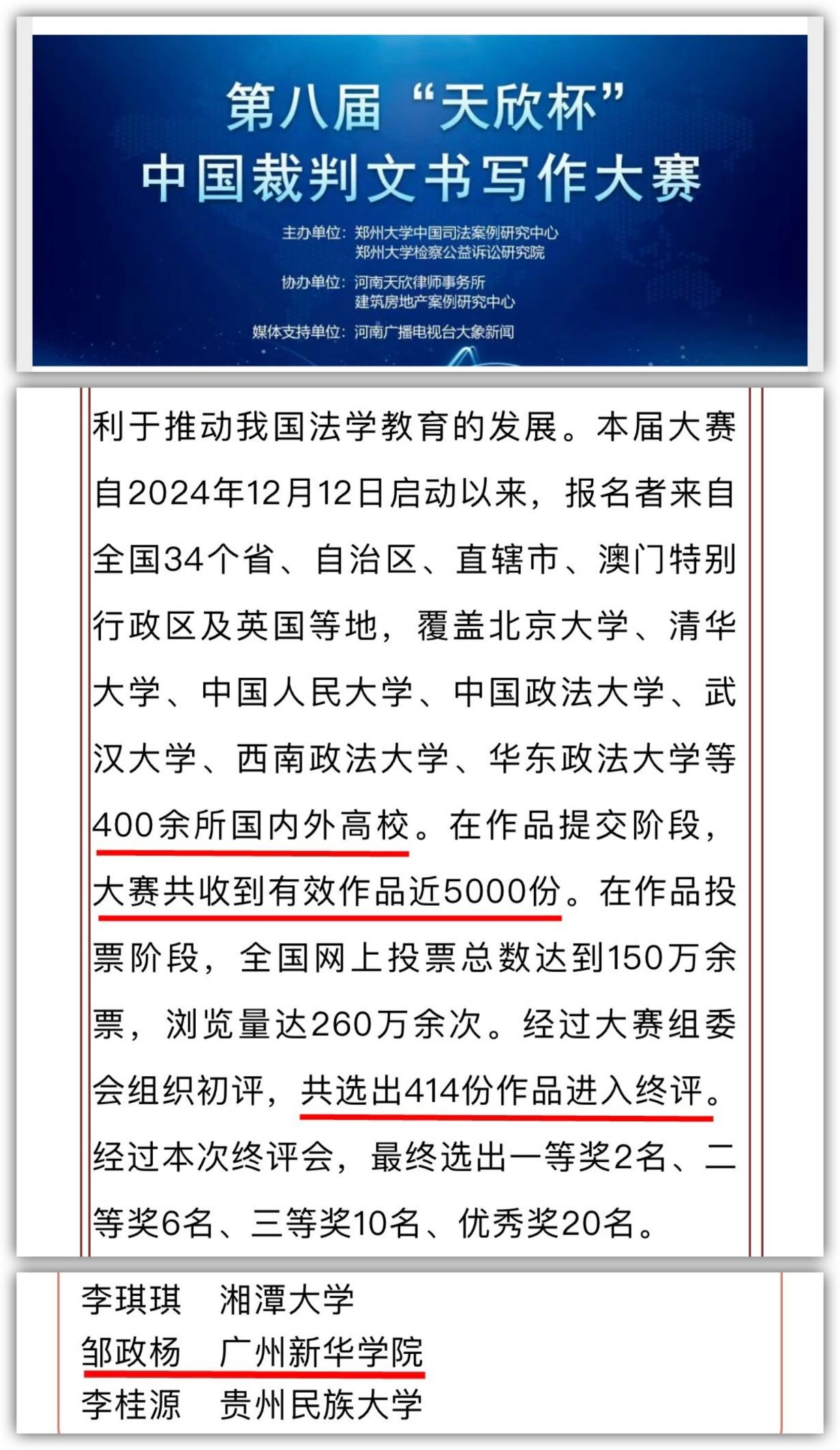 “天欣杯”中国裁判文书写作大赛作为国内法学教育界公认的权威赛事,由郑州大学中国司法案例研究中心主办,河南天欣律师事务所等协办,旨在弥合法学教育与司法实践的鸿沟,全面提升法科学生的裁判文书写作能力与实务素养。本届大赛堪称一场法学界的“华山论剑”,吸引了北京大学、清华大学、中国政法大学、西南政法大学等 400 余所国内外顶尖高校的学子踊跃参与,覆盖全国 34 个省、自治区、直辖市、澳门特别行政区及英国等地。共收到 1743 份有效作品,经过严格初评,仅有 414 份作品进入终评,最终仅 38 人获奖,整体获奖率约 2%,研究生与本科生同台竞技,竞争激烈程度可见一斑。