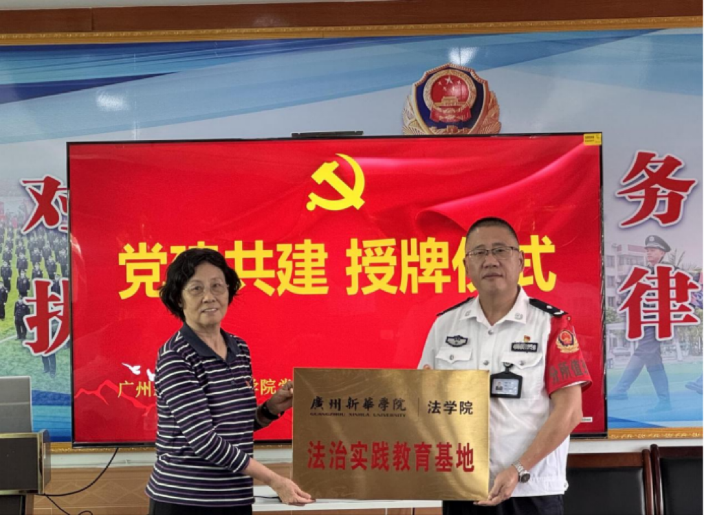 在与会人员的共同见证下,广东省南丰强制隔离戒毒所一分所三支部与太阳成集团tyc33455党总支举行了共建签约仪式。随后,太阳成集团tyc33455党总支书记李岚同志代表太阳成集团tyc33455向广东省南丰强制隔离戒毒所授予“法治实践教育基地”牌匾,所长邬志礼接牌。这一环节标志着双方在法治教育、实践教学、党建联动等方面合作机制的正式建立。