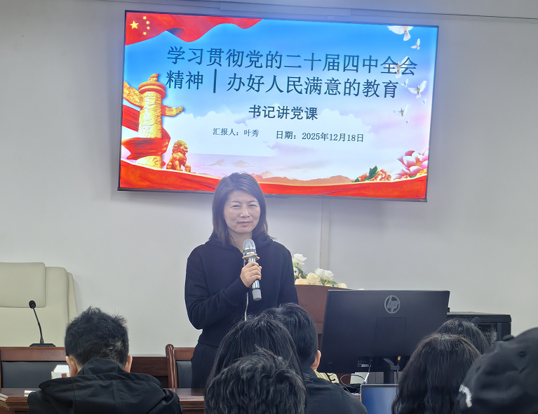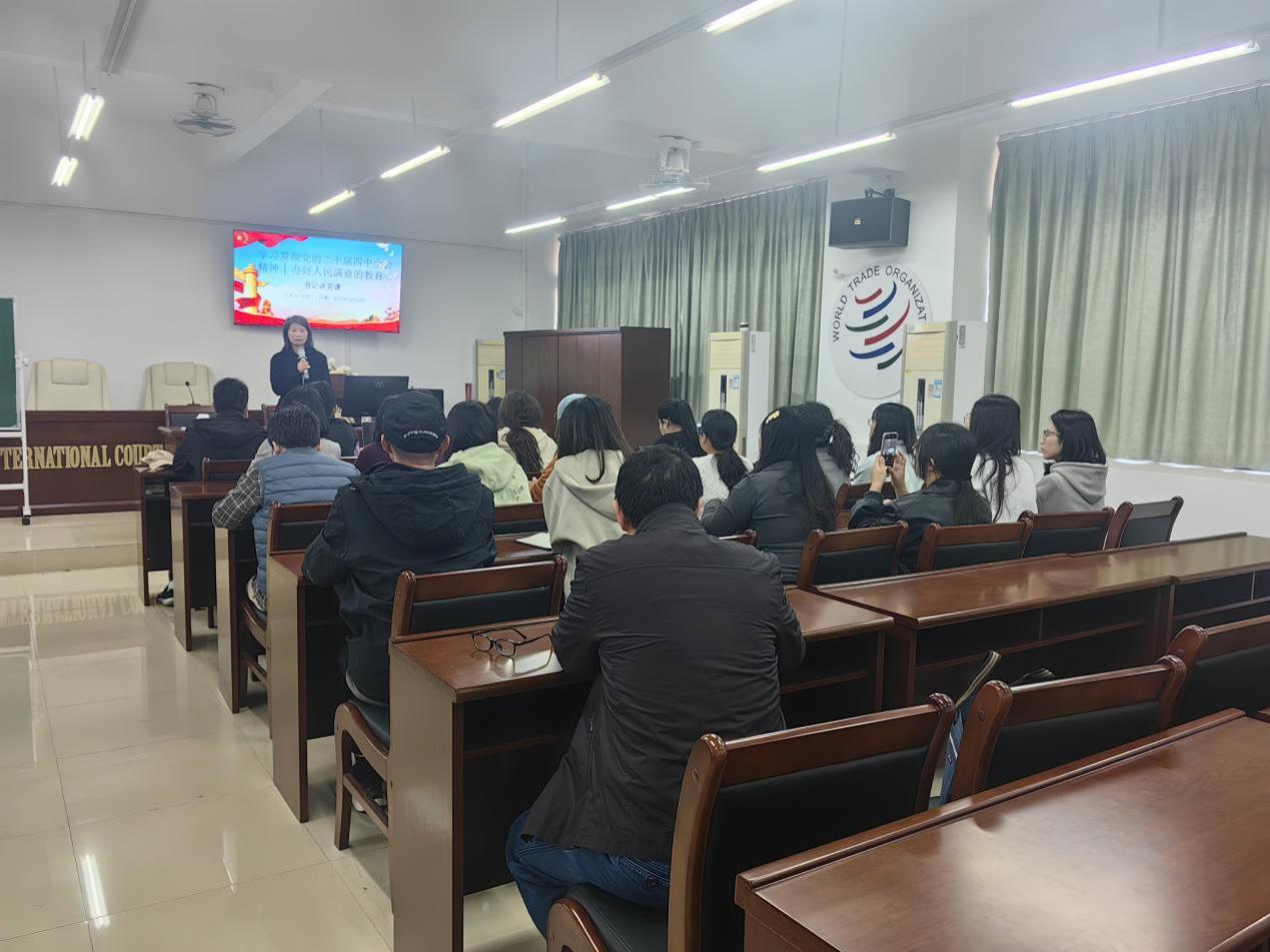 为深入学习贯彻党的二十届四中全会精神,切实把思想和行动统一到党中央决策部署上来,扎实推进法学教育事业高质量发展,2025年12月18日,太阳成集团tyc33455教工党支部组织开展“学习贯彻党的二十届四中全会精神,办好人民满意的教育”专题党课活动。本次党课由教工党支部书记叶秀主讲,全体党员教师参加学习并展开深入研讨。