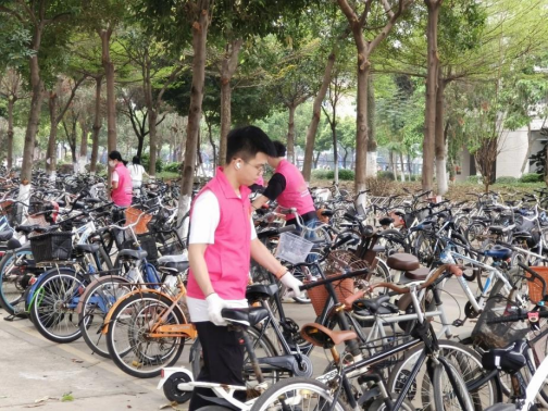 绿荫走道里,单车停放间,志愿者手带白色手套,一手扶着车头,一手扶着座椅,深吸一口气,便开始了搬车行动。不一会儿,歪七扭八的单车便被志愿者整整齐齐的摆放成一条直线。