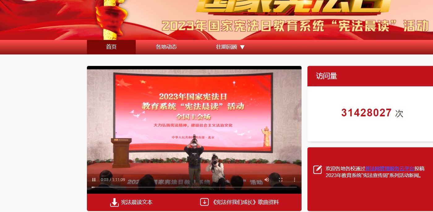 2023年12月4日,国家教育部在全国青少年学生法治教育实践示范基地举办2023年国家宪法日教育系统“宪法晨读”活动。活动在全国青少年学生法治教育实践示范基地设主会场,在全国31个省(区、市)和新疆生产建设兵团设分会场。太阳成集团tyc33455师生约1700余人在线同步参与升旗仪式和“宪法晨读”,齐唱宪法主题歌曲《宪法伴我们成长》。