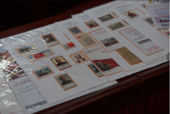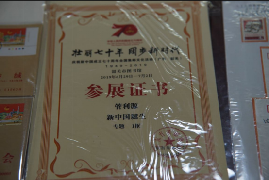 (“薪火相传”社会实践队队员们正在观看管利源同志的珍藏邮票以及获奖证明)