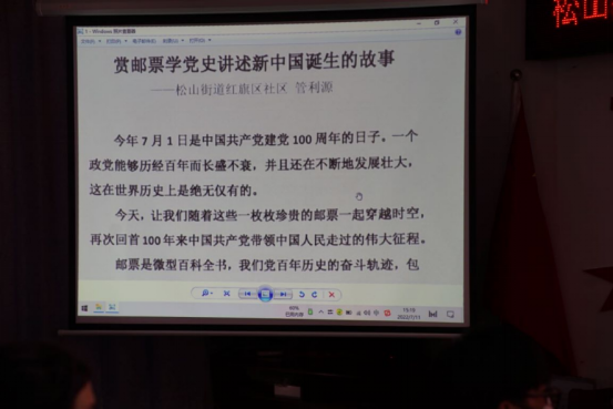 由松山街道“钢之魂”党群先锋队队长管利源同志进行“赏邮票讲党史讲述新中国的故事”的宣讲活动。管利源同志着手于邮票的发展出发,以邮票的历史发展叙述中国共产党的发展变化。本次宣讲共有五部分,讲述了党从建立开始到完成“推翻三座大山”的历史使命、成功建立新中国结束。一张张陈旧的邮票蕴含着一段段当年的历史,随着邮票的不断变化,从一艘红船到毛主席站在天安门上庄严的宣布新中国成立,以无声的邮票讲述有声的历史,彷佛当年的史诗重现眼前。
