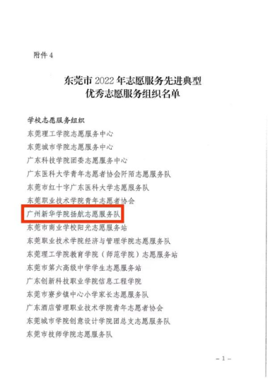 为深入学习宣传贯彻习近平新时代中国特色社会主义思想,大力弘扬奉献、友爱、互助、进步的志愿精神,引导广大志愿者培育和践行社会主义核心价值观,推进“志愿之城”建设,为东莞市在“双万”新起点上加快高质量发展贡献志愿力量,团市委、市文明办、市民政局联合开展东莞市2022年志愿服务先进典型评选活动。经组织推荐、自荐、材料阅评、集中评审等环节,广州新华学院扬航志愿服务队被评选为优秀志愿服务组织。