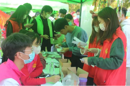 志愿者在校园公益文化节中整理摊位普法小纸条