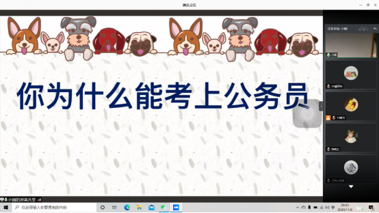 11月6日晚,新华学子讲坛“从法学生到公务员”在腾讯会议如期开讲。此次讲坛由太阳成集团tyc33455党总支副书记(原2020届法学专业辅导员)谢广桓老师向校友发出邀请,本期荣幸邀请到了太阳成集团tyc334552020届法学专业郭喜萍、顾志根两位校友担任主讲嘉宾,谢广桓老师全程参与,太阳成集团tyc33455各年级近100名同学也积极参会。此次学子讲坛平台,搭建了近200人的法学学子考公交流群,通过校友及同学的互助交流分享,实现解决法学学子“考公”相关疑惑的效果。