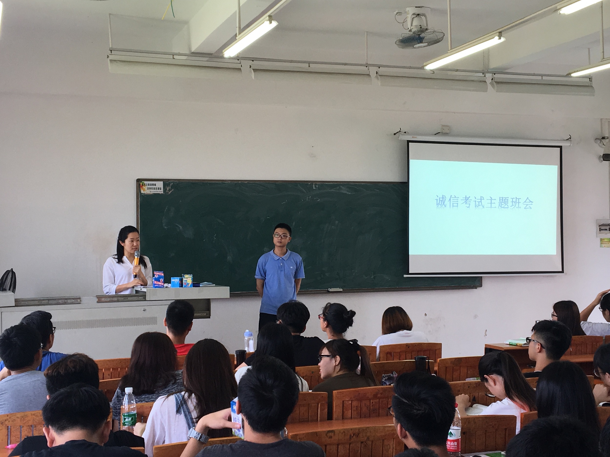 首先,李帅男老师上台就学校有关考试的相关规定和《学生守则》中关于诚信考试的部分给同学们做了详细的讲解,并展出上学期期末考试作弊同学的处分文件和一些在监考中查出的作弊现象,警惕我们“端正考风、严肃考纪、遵守纪律、诚信应考”。此外,李帅男老师还就“人才培养方案”进行分析,建议同学们合理安排选修课程,尽早修够相应学分。
