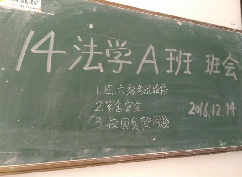 2016年12月14日星期三,14级法学A班在定静楼一c304召开了“诚信考试,防范盗窃,拒绝裸贷”主题班会。本次班会在法律学系14级辅导员温雯菲老师的指导下开展,由A班班长宋宝雯主持。