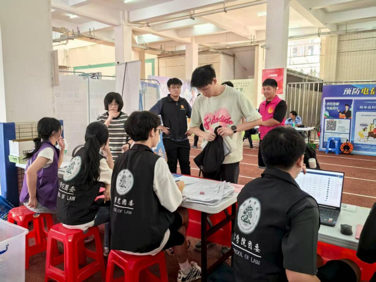 迎新当日的骄阳,未能阻挡师生们的热情。志愿者们精心布置的迎新现场营造了一种温馨而热烈的迎新氛围。他们穿着各色的马甲,每一个身影都在传递“归属感”。报到点精心设计的宣传展板与拍照打卡点,为新生搭建起展示自我、记录成长的舞台,更成为他们与校园初遇的美好印记。相信新生们会怀揣对法学的热爱,踏上新的“法途”征程。