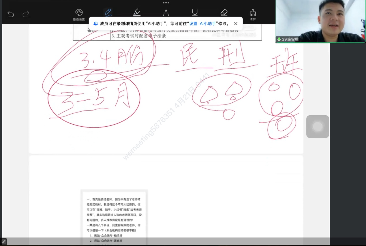 施安楷首先结合自己一年通过法考、顺利入职法院的经历,梳理出“从大三到毕业”的关键时间线。他建议同学们在大三下学期即进入备考状态:4—6月夯实基础,选一门最感兴趣的学科“破冰”,配合刷题;7—8月留校高强度冲刺,不被假期分心;客观题结束后立即转向主观题训练,通过真题全文录入练习提升“输出”速度与条理。他强调,法考通过率与投入时长成正比,而暑期留校往往是决定成败的临界点。