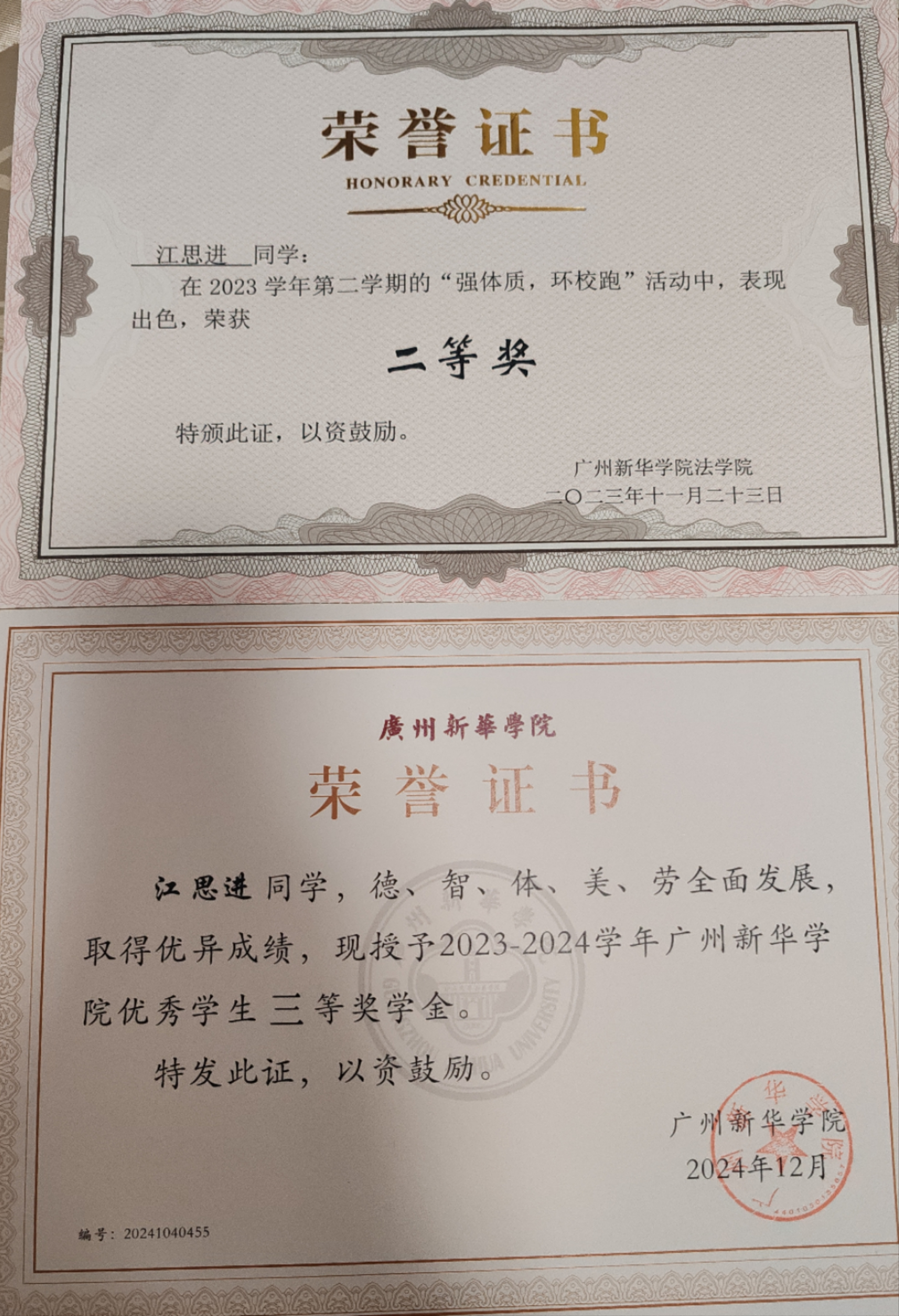 1.2023-2024在广州新华学院荣获“三等奖学金”。