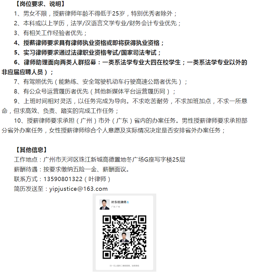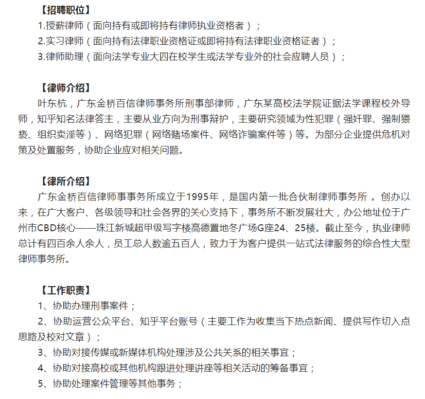 招聘信息-叶东杭律师招聘信息(授薪律师实习律师律师助理)