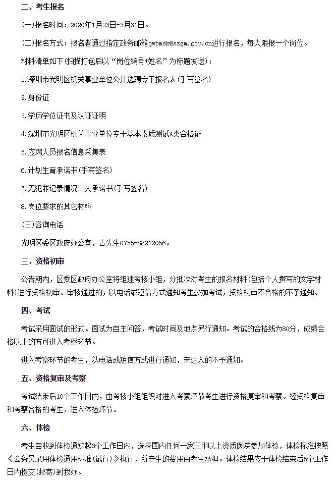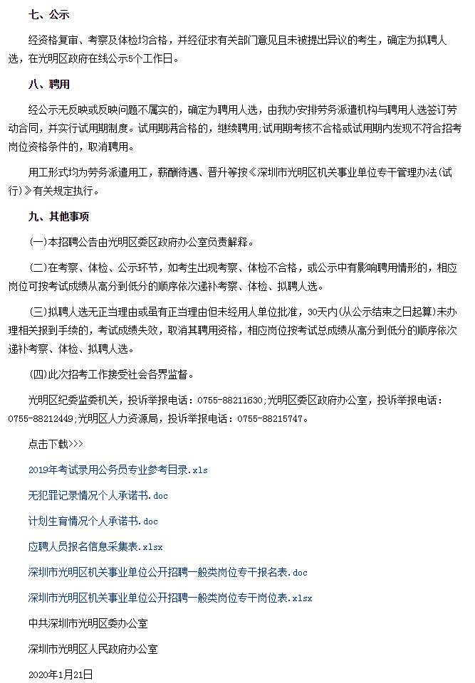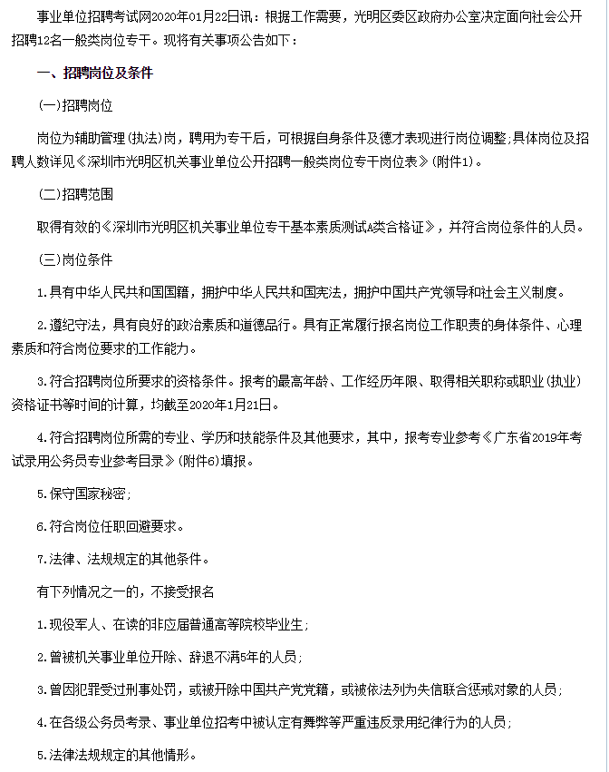 招聘信息-2020年深圳市光明区人民政府办公室招聘一般类岗位专干公告