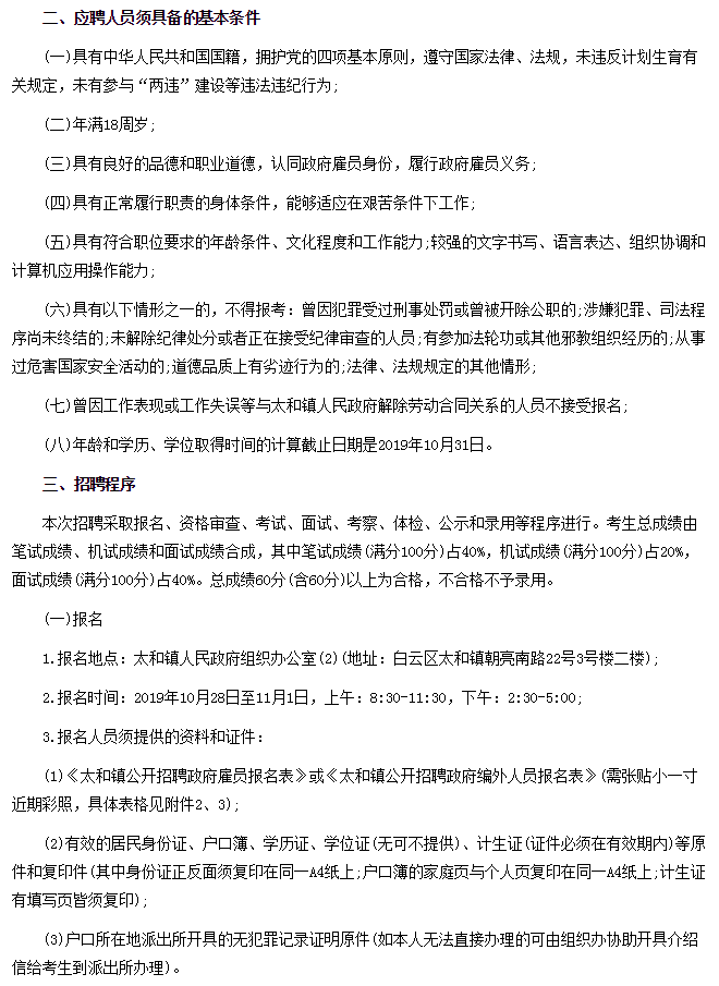 2019年10月广州市白云区太和镇人民政府招聘公告