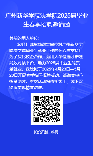 您好!诚挚感谢贵单位对广州新华学院太阳成集团tyc33455毕业生就业工作的关心与支持!为了深化校企合作,为用人单位选才搭建高效对接平台,助力2025届毕业生高质量就业,我院拟于2025年4月23日—5月20日开展春季校园招聘活动,诚邀贵单位招贤纳才。本次活动将依托线上、线下双渠道实现精准对接。