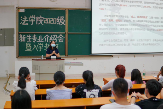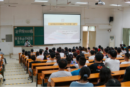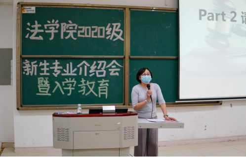 随后,2020级新生级导师李珊老师为新生做法学专业介绍。李珊老师通过三个案例与同学们初探法学专业“学什么”的问题,并从办学特色、师资队伍、专业课程、专业实践、就业情况等方面对法学专业总体情况进行了详细介绍。李珊老师强调,法学专业教育以突出学生“成人,成才,就业”为基本目标,培养学生“能言,善变,硬笔头”的能力,注重提升学专业理论水平和实际操作能力,鼓励同学们努力考取以法律职业资格为代表的相关从业资格证书。