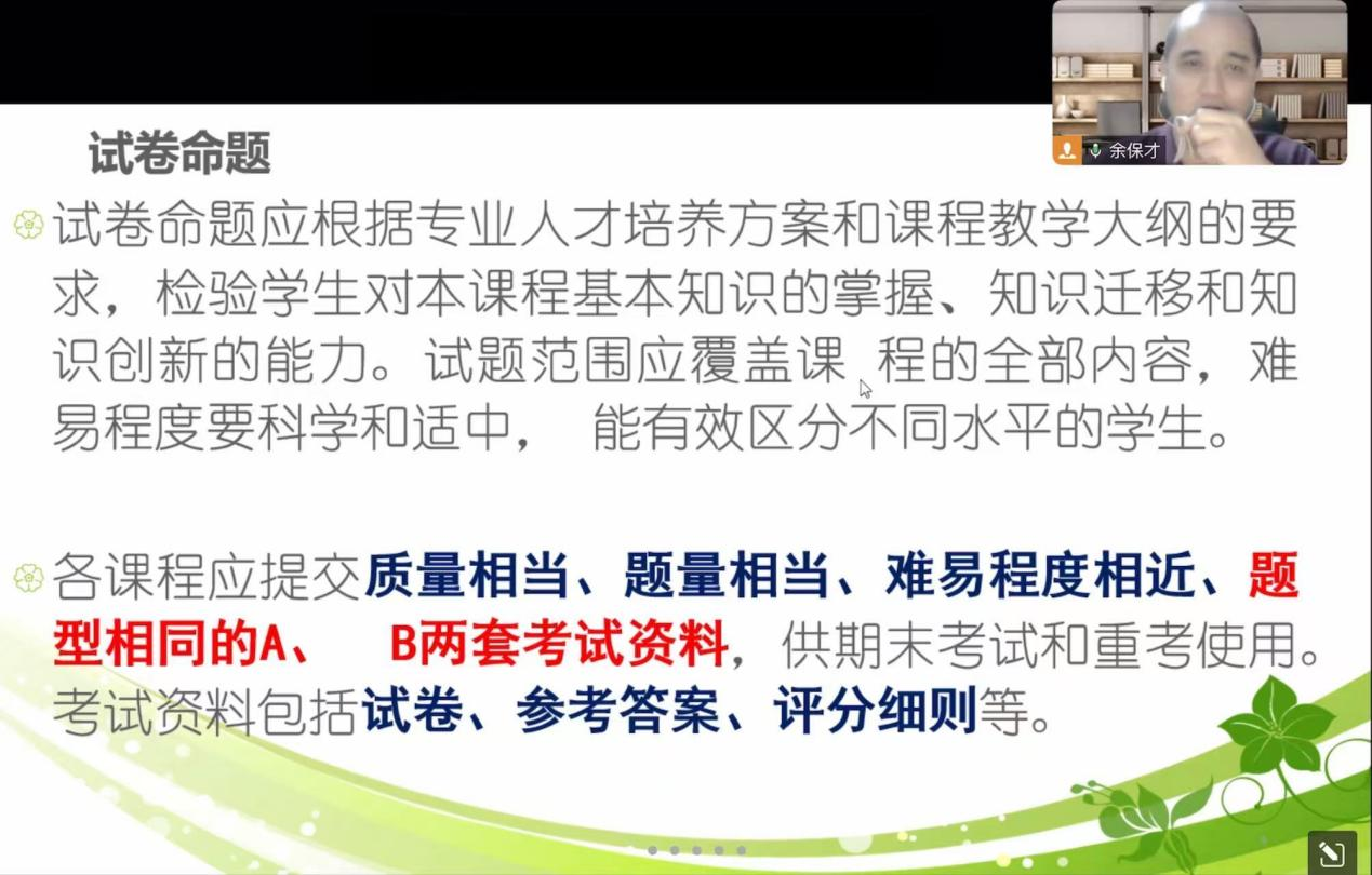 最后针对试卷归档工作,余主任详细说明需要按照封面列明顺序整理,整理完成后进行规范装订。对于以期末论文为考核方式的课程,归档时需要补充提交论文的评判依据等关键材料。平时作业的归档应分类单独归档,确保材料完整可查,满足学校教学质量核查要求。