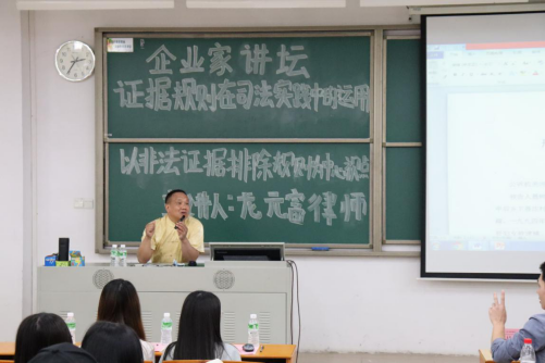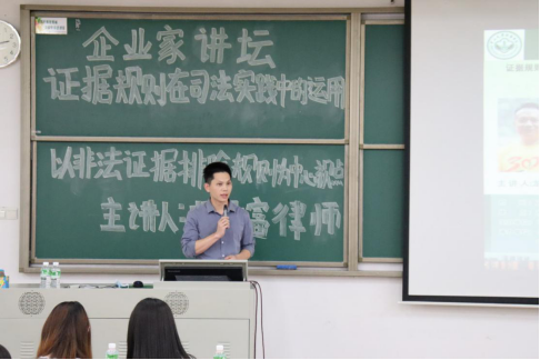 讲坛采用授课与现场调查和问答相结合的方式进行。龙元富律师以刑事诉讼法中的非法证据排除规则为中心视点向现场同学阐述了证据规则法,同时现场解答了同学们对于证据规则的困惑。