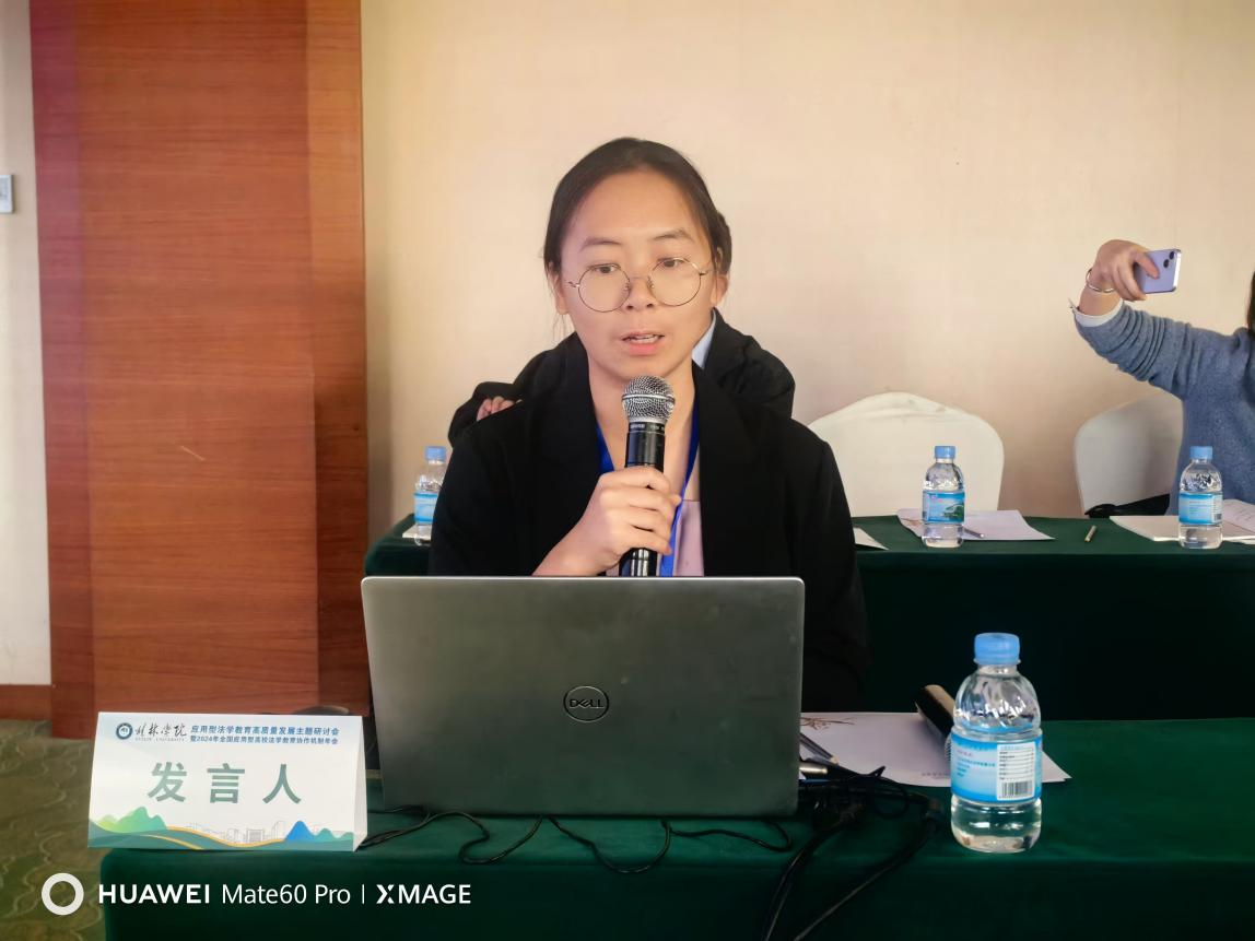 本次会议以“应用型法学教育的高质量发展”为主题。桂林学院金融与法律学院党总支书记陈俊杰主持开幕式,桂林学院副校长杨庆庆、广西法学教育研究会会长陈宗波、全国应用型高校法学教育协作机制秘书长刘红、深圳市亚讯威视数字技术有限公司总经理张纪等领导、学者先后致辞发言。围绕着“法学学科竞赛与新质生产力人才培养”“通用型人工智能及虚拟仿真技术赋能应用型高校法学教育”“应用型高校法学教育高质量发展与本科教学合格评估”三大分议题,上海杉达学院、广州培正学院、重庆人文科技学院等专家学者进行了发言。我院冯家欣老师就“法学类虚拟仿真实验课程的建设现状与思考”进行汇报发言。