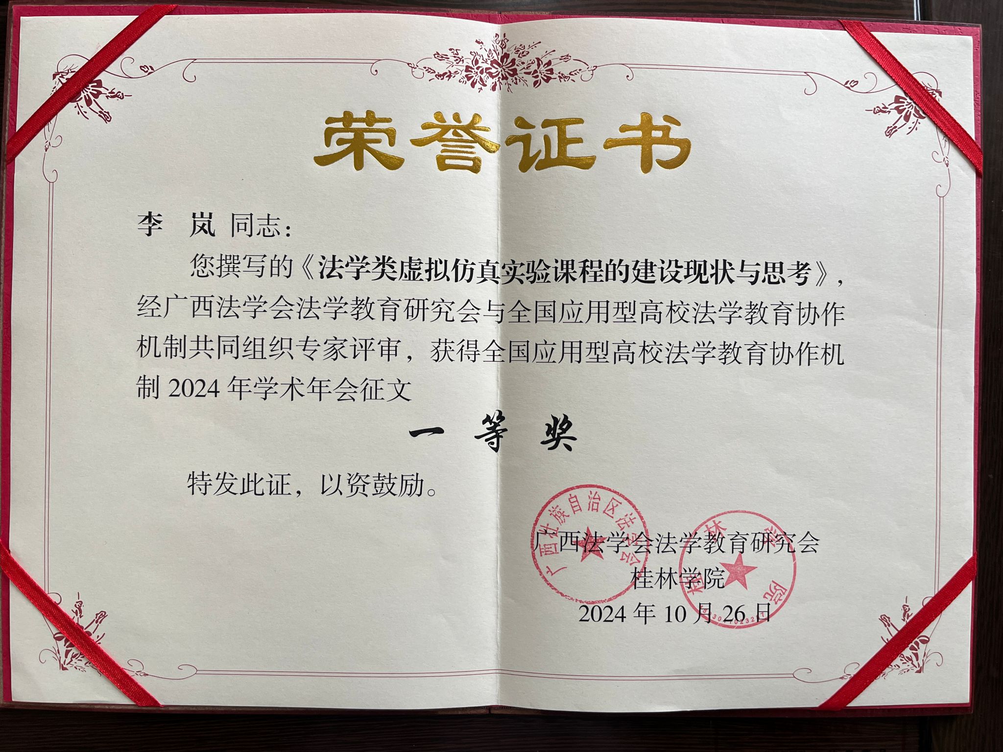 2024年10月25日-28日,为深入学习2023年2月中共中央办公厅、国务院办公厅印发的《关于加强新时代法学教育和法学理论研究的意见》,贯彻落实习近平法治思想,促进民办高校法学学科建设和专业发展,以适应法治中国建设对复合型法律人才培养提出的新要求,由全国应用型法学教育协作机制和桂林学院联合主办,中国政法大学出版社等协办的“应用型法学教育高质量发展主题研讨会暨2024年全国应用型高校法学教育协作机制年会”在广西桂林举行。我院教师代表执行院长李岚、专职教师冯家欣受邀参加此次会议。