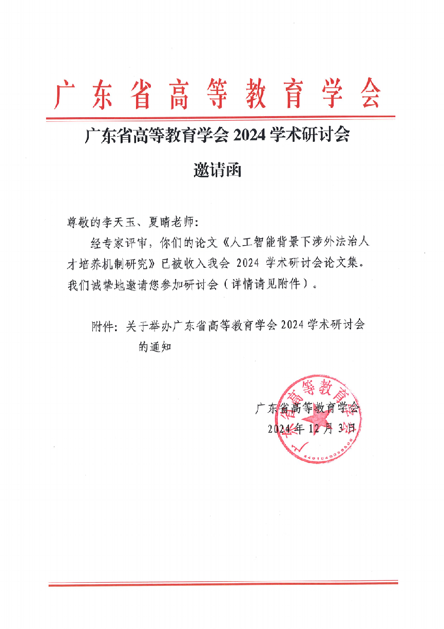 12月7日,广东省高等教育学会2024学术研讨会在佛山大学仙溪校区隆重召开。本次会议以“深化高等教育综合改革,加快高等教育强省建设”为主题,汇聚了来自广东省内外的高校领导、专家学者以及行业企业负责人,共计500余人参会。我院李天玉老师和夏晴老师受邀出席,并积极参与相关议题的研讨与交流。