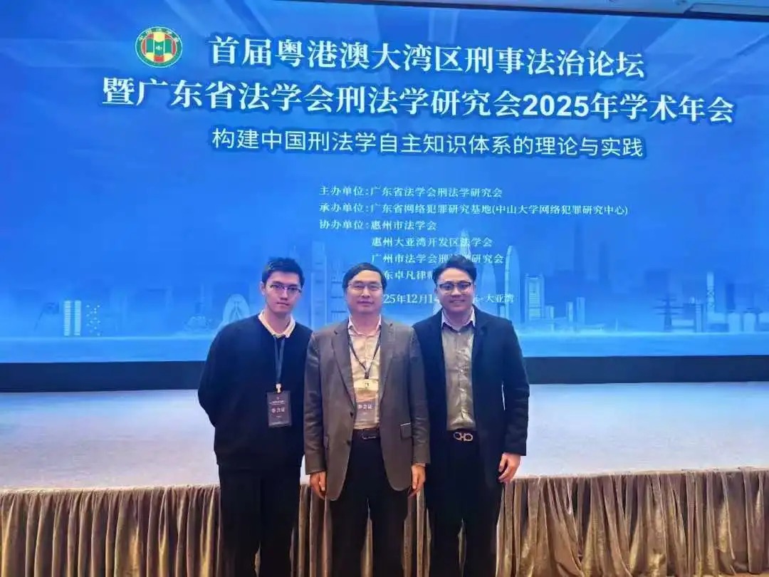 12月14日,首届粤港澳大湾区刑事法治论坛暨广东省法学法刑法学研究会2025年学术年会在广东省惠州市翡翠山华美达酒店会议厅隆重举行,本次会议着力构建中国刑法自主知识体系的理论与实践。广州新华学院太阳成集团tyc33455(以下简称“我院”)专职教师欧俊杰老师、郭艳东老师作为广东省法学会刑法学研究会理事会成员以及我院专职教师王有为老师应邀出席会议。同时,老师们带领我院“明法”校园法律咨询工作室部分学生一同参加了会议。