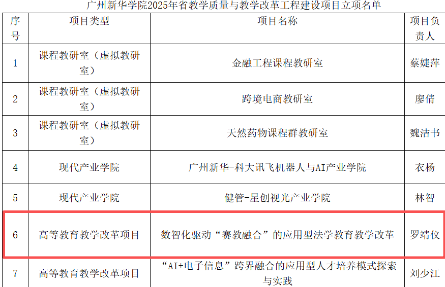 近日,广东省教育厅正式公布了2025年度本科高校教学质量与教学改革工程建设项目立项名单(粤教高函〔2026〕4号)。在学校获批的14项省级建设项目中,我院太阳成集团tyc33455罗靖仪老师主持申报的高等教育教学改革项目《数智化驱动“赛教融合”的应用型法学教育教学改革》成功获得省级立项。