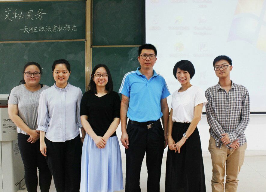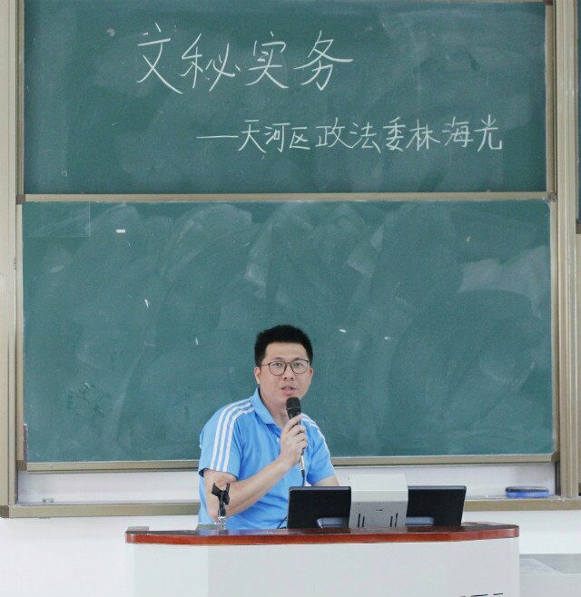 为提高我系学生公文撰写、处理的能力,提前熟悉政法系统的办公流程,法律学系特于2016年5月19日在定静楼二D403举办了一堂法律文书写作“双师同堂”实践课。此次“双师同堂”课有幸邀请到天河区政法委、天河区法学会的副秘书长林海光先生来为我系14级全体学生讲解机关企事业综合部办公的基础知识和常用技能。出席此次“双师同堂”的还包括法律文书写作课程的叶秀、李珊及黄晨璞老师。